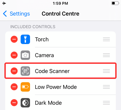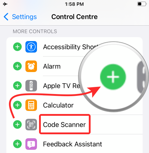 - 检查您是否可以在下一个屏幕上的“包含的控件”下看到代码扫描器快捷方式。如果没有,请向下滚动并点击“更多控件”下代码扫描仪左侧的 + 图标。