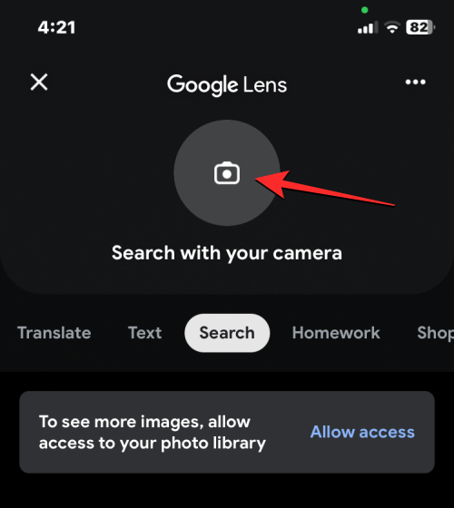 - 这将打开 Google Lens,它是适用于 iOS 的 Google 应用程序的一部分。您无需再次安装 Google 智能镜头应用即可使用此功能。在 Google Lens 屏幕中,点击顶部的相机按钮。