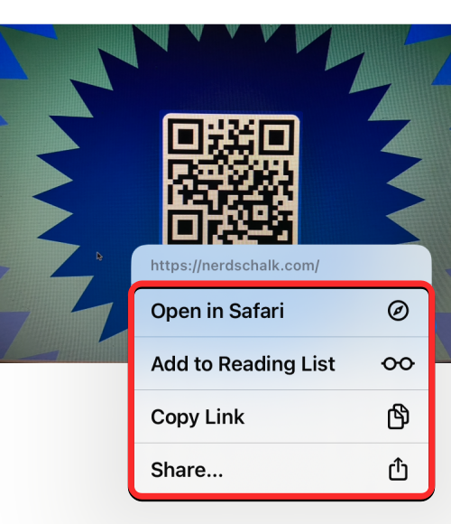 - 在这种情况下,“照片”应用程序会显示一个溢出菜单,其中显示 QR 码上存在的链接,以及用于在 Safari 中打开链接、复制链接、共享链接以及将网页添加到 Safari 阅读列表的其他选项。
