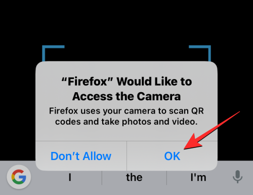 - 如果您尚未授予 Firefox 访问 iPhone 相机的权限,系统将提示您批准此访问权限。在此提示中,点击确定以允许Firefox使用您的相机。
