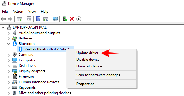 - 转到设备管理器中的蓝牙适配器,然后右键单击它。选择更新驱动程序。