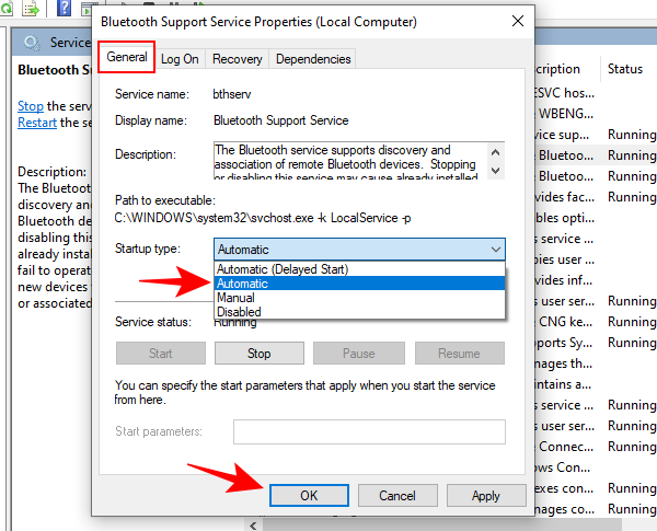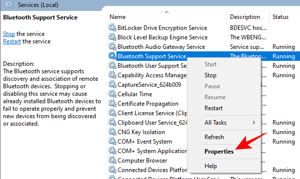 Win+R - 这将打开“服务”窗口。现在,查找蓝牙支持服务,右键单击它,然后单击属性。