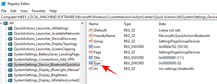 HKEY_LOCAL_MACHINE\SOFTWARE\Microsoft\Windows\CurrentVersion\ActionCenter\Quick Actions\All\SystemSettings_Device_BluetoothQuickAction