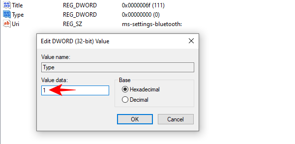 - 将“数值数据”从 0 更改为 1。单击“确定”。