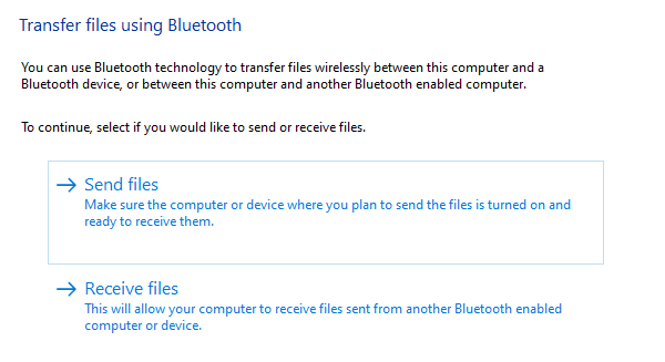 - 在“蓝牙文件传输”窗口中,单击发送文件或接收文件,具体取决于您要执行的操作,然后按照提示成功传输文件。