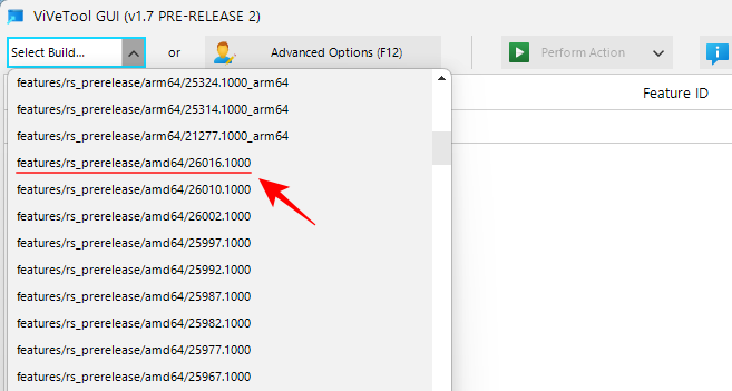 - ViVeTool GUI 打开后,单击左上角的“Search Build”下拉菜单。