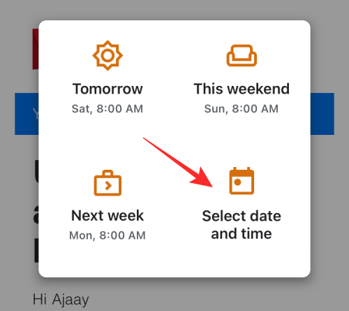 - 在显示的溢出菜单中,选择您希望收到此电子邮件通知的时间。您可以从此菜单中选择任何默认时间——今天晚些时候、明天、本周末或下周。除了这些选项之外,您还可以看到贪睡时间结束的日期和时间。