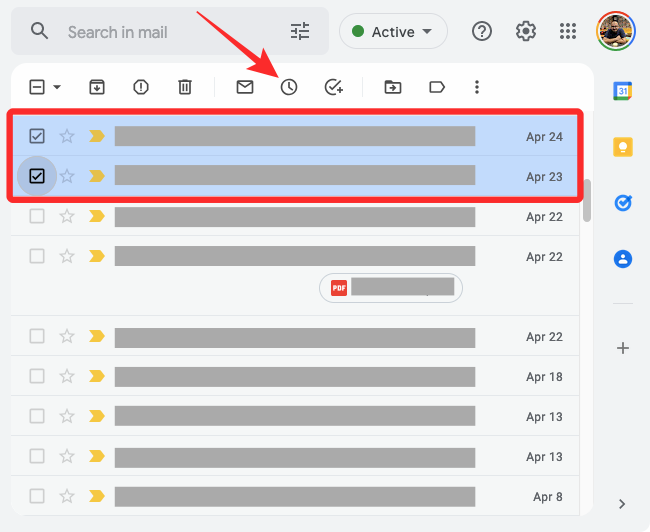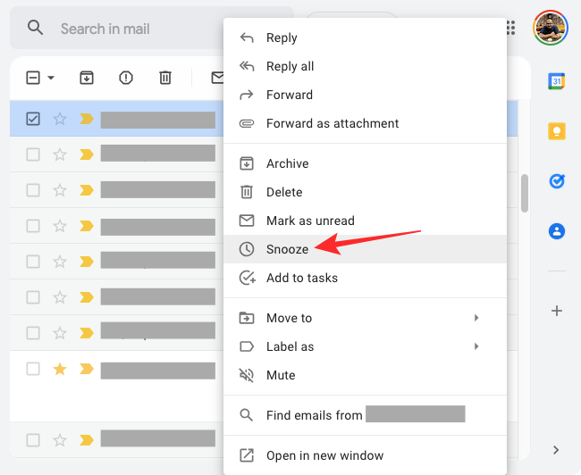 您还可以通过选中要延后的电子邮件左侧的框来一次暂停多封电子邮件。选择所需的电子邮件后,单击顶部的“贪睡”按钮,然后按照与上述相同的步骤设置暂停持续时间。