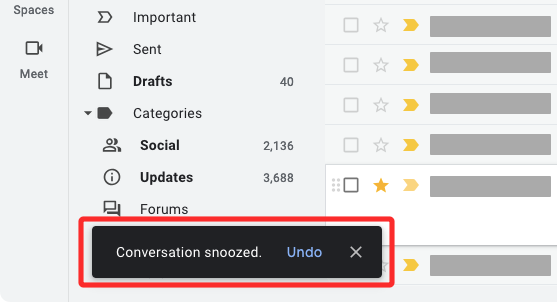 当电子邮件在 Gmail 中被暂停时,系统会自动将其从收件箱中移除并发送到“延后”文件夹。根据您用于延后消息的设备,您应该会在底部看到横幅,上面写着“对话已延后”或“延后至<日期和时间>”,并带有“撤消”选项,可帮助您取消延后可能被错误延后的消息。