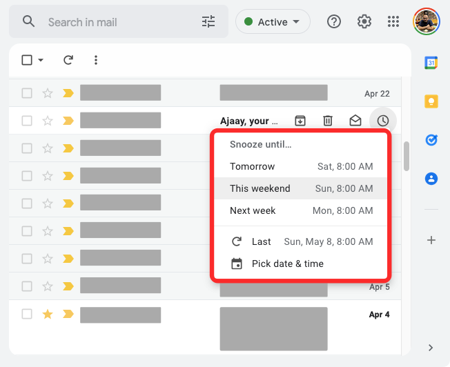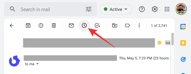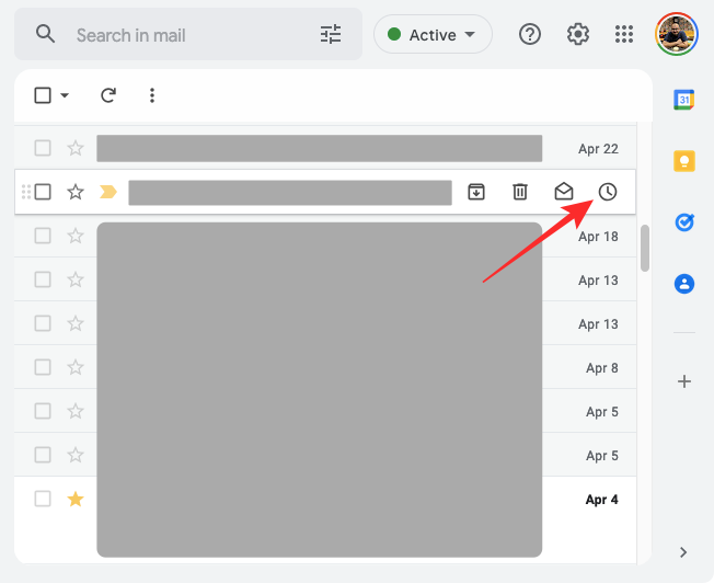 - 要在网络上暂停电子邮件,请在网络浏览器上打开 Gmail,然后将鼠标悬停在要暂停的电子邮件上。现在,单击电子邮件最右侧的“贪睡”按钮(由时钟图标标记)以获取更多选项。