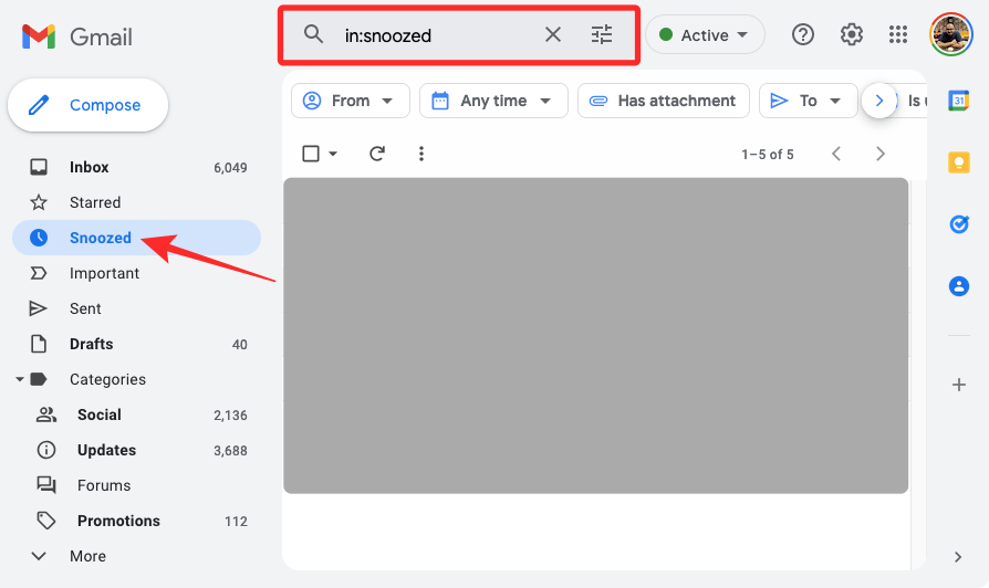 - 要在计算机上访问暂停的电子邮件,请在网络浏览器上打开 Gmail,然后单击左侧边栏上的“暂停”选项卡。或者,您也可以在 Gmail 搜索栏中输入“in:snoozed”运算符来访问此文件夹。