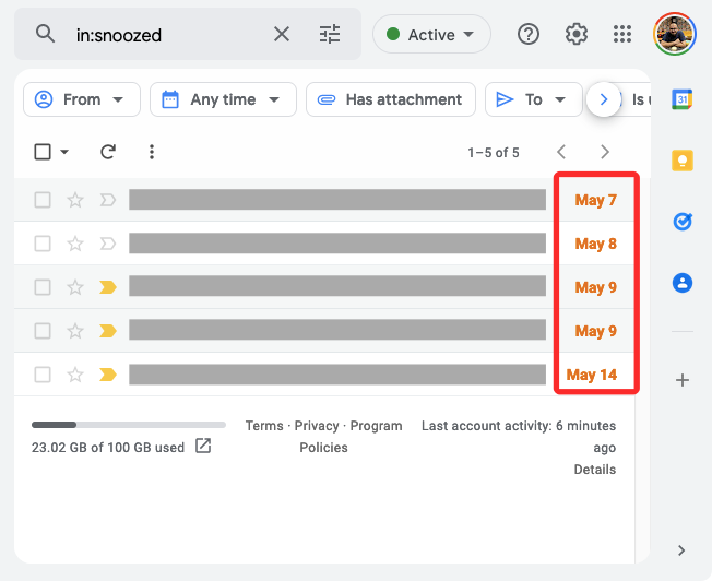 - 您应该能够看到您打盹的所有电子邮件,并详细说明它们因在最右侧以红色显示而被打盹了多长时间。您可以单击任何暂停的电子邮件来打开它们,它们将在不被暂停的情况下打开。