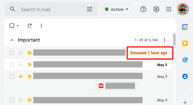 暂停期结束后,暂停的电子邮件将重新出现在您的 Gmail 收件箱中,并且您会收到通知,就像接收新电子邮件一样。区分新电子邮件通知和延后电子邮件通知的一种方法是,后者将带有“延后”标签。当暂停持续时间结束时,暂停的电子邮件将占据收件箱的顶部,并且它们将保持在顶部,直到新电子邮件到达您的收件箱。