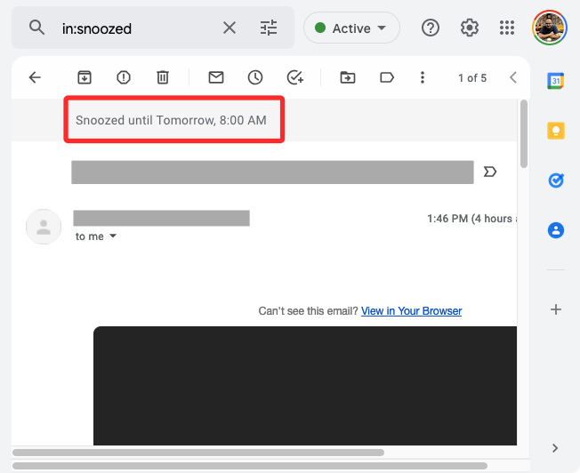 - 现在,您将看到您暂停的所有电子邮件,在每封电子邮件的底部,您会看到一个红色的“暂停至<日期和时间>”标签,以显示它们暂停了多长时间。