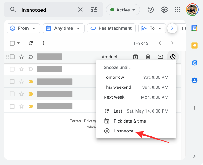 - 在这里,您应该能够看到之前打盹的所有电子邮件。要取消暂停电子邮件,请将鼠标悬停在“暂停”文件夹中,然后单击“暂停”按钮(标有时钟图标的按钮)。