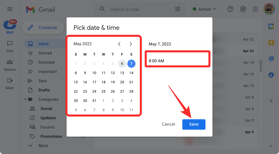- 将出现一个对话框,您可以在其中查看日历和其他一些选项。从日历中选择您希望收到通知的日期,然后在右侧输入您的首选时间。选择首选的贪睡持续时间后,单击“保存”。