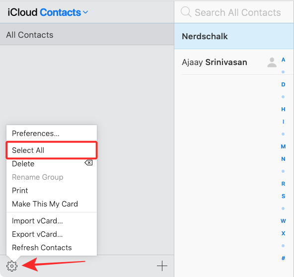 - 要选择所有联系人,您可以使用 Command(或 Ctrl)+ A 键盘快捷键。或者,您可以单击“联系人”页面左下角的齿轮图标,然后使用“全选”选项选择所有联系人。