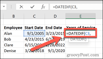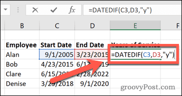 - 单击包含结束日期的单元格,输入逗号,然后输入: “y”)