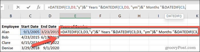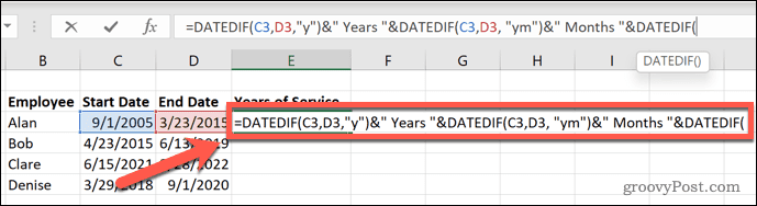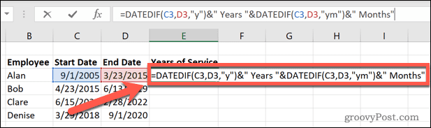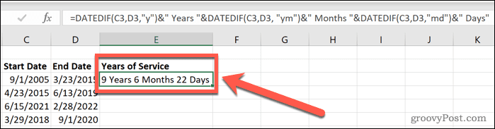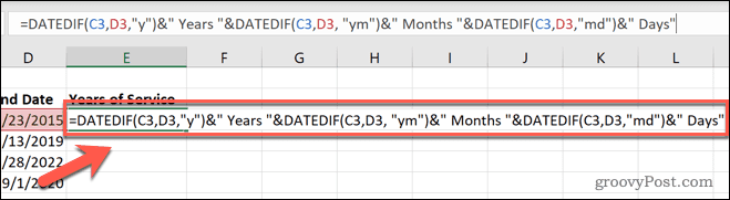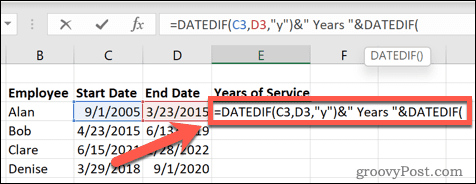 - 单击结束日期单元格,输入逗号,然后输入: “y”)&“ Years ”&DATEDIF(