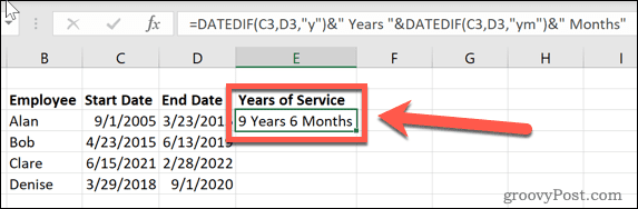 上述所有计算均假设您正在计算具有开始日期和结束日期的某人的服务年限。如果员工仍在工作,那么您需要计算从他们开始日期到现在的服务年限。这种方法的美妙之处在于结果每天都会更新,因此始终保持准确。