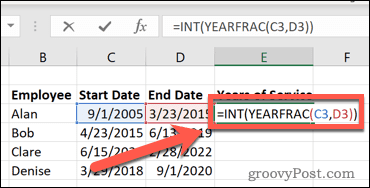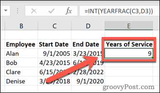 如果您只想查找已服务的总年数,那么 YEARFRAC 函数是一种简单的方法。此函数将两个日期之间的差作为一年的一小部分返回;它通常用于计算诸如全年福利中需要支付的部分。如果时间长度超过一年,则小数点前的值为这两个日期之间的完整年数。我们可以使用 INT 函数只返回这个数字。