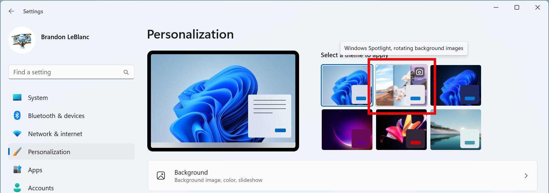 - 打开设置应用程序并转到个性化部分。Windows Spotlight 主题应紧邻其他默认主题。