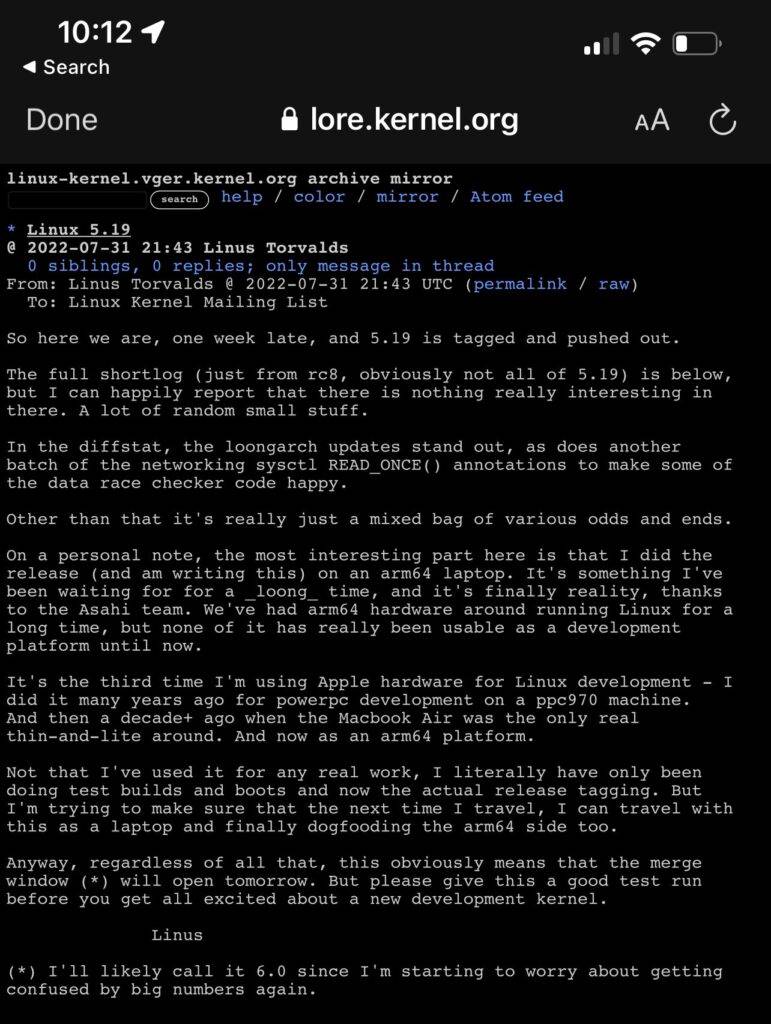 Linux 5.19 正式发布,而「Linux 之父」Linus Torvalds 以Linux Kernel Mailing List 分享一些趣事,那就他的Linux 5.19 开发工作是使用arm64 手提电脑完成。