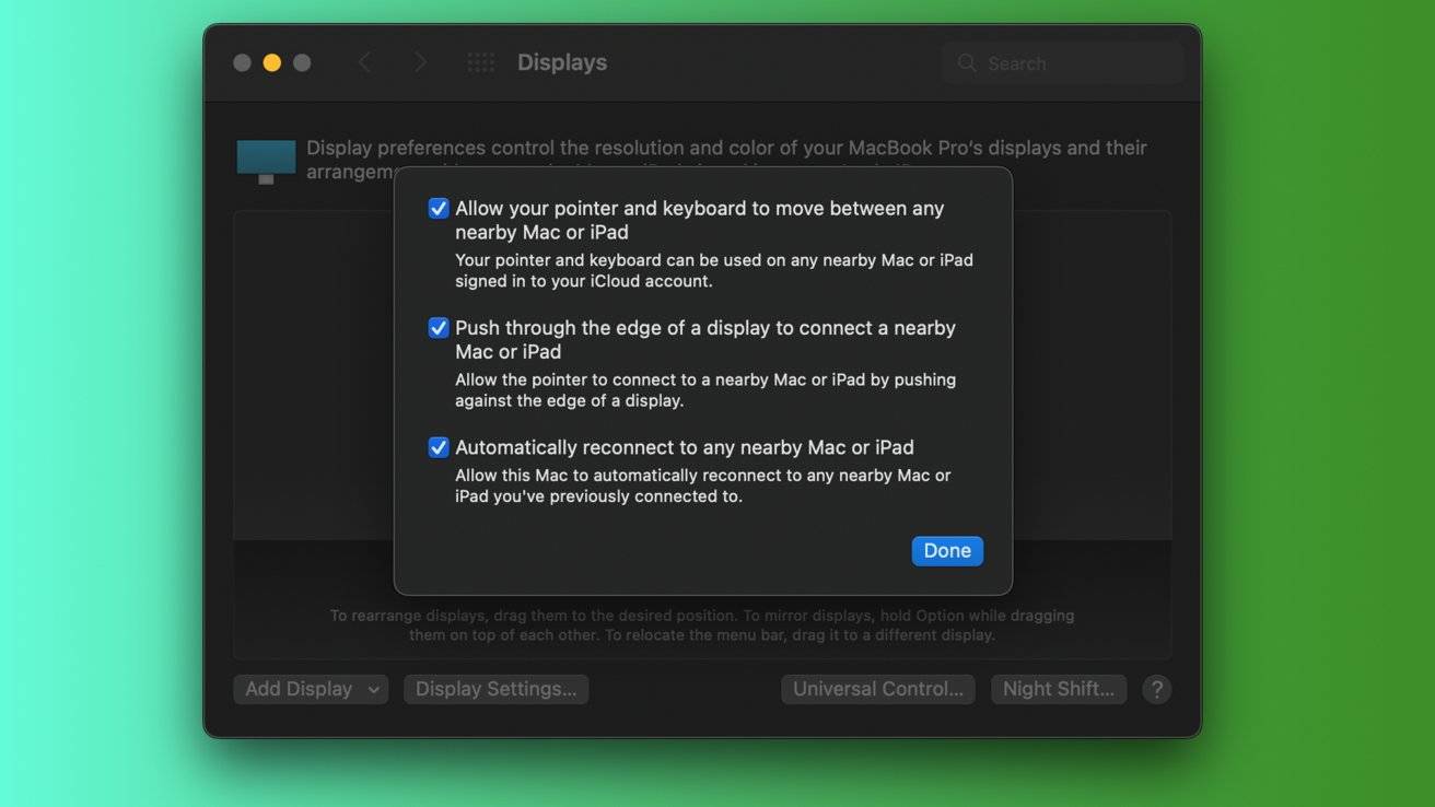 无需额外设置。只要所有设备同时满足要求,Universal Control 就可以使用了。
