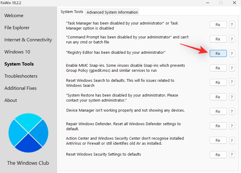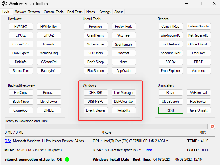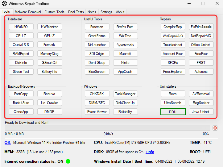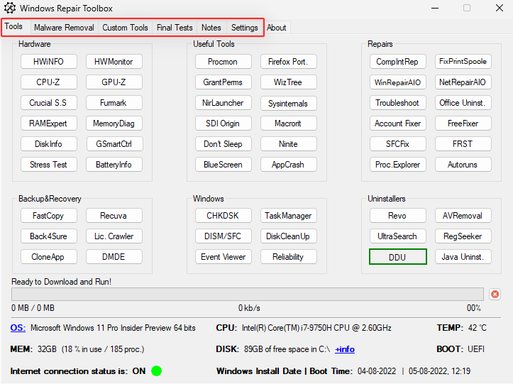 Windows 修复工具箱附带各种内置修复程序以及可进一步用于解决系统问题的工具链接。根据您面临的问题,第一页将帮助您找到大多数第三方工具。