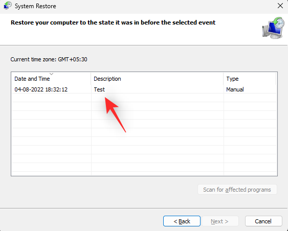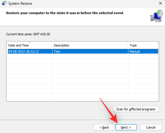 现在单击并从屏幕上的列表中选择一个相关的还原点。