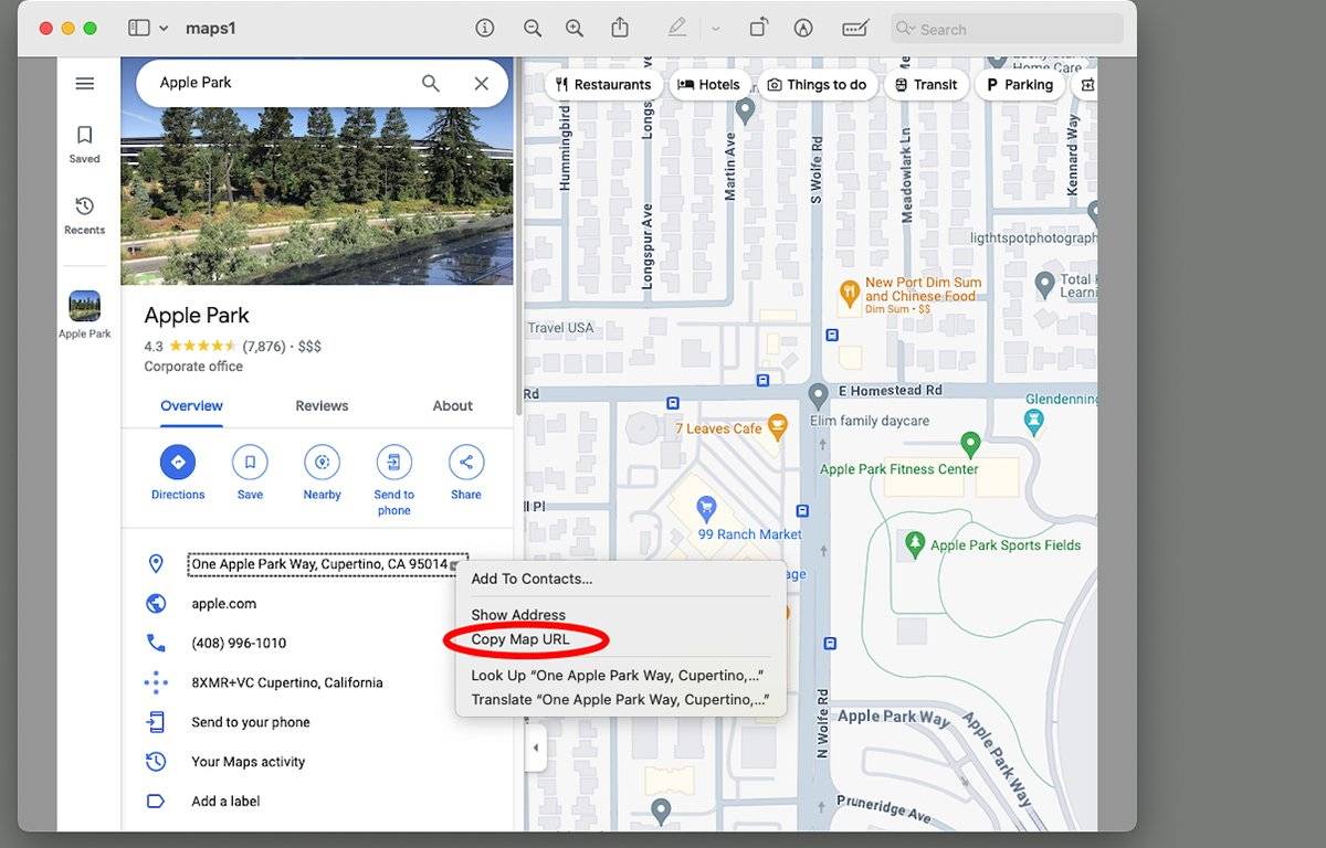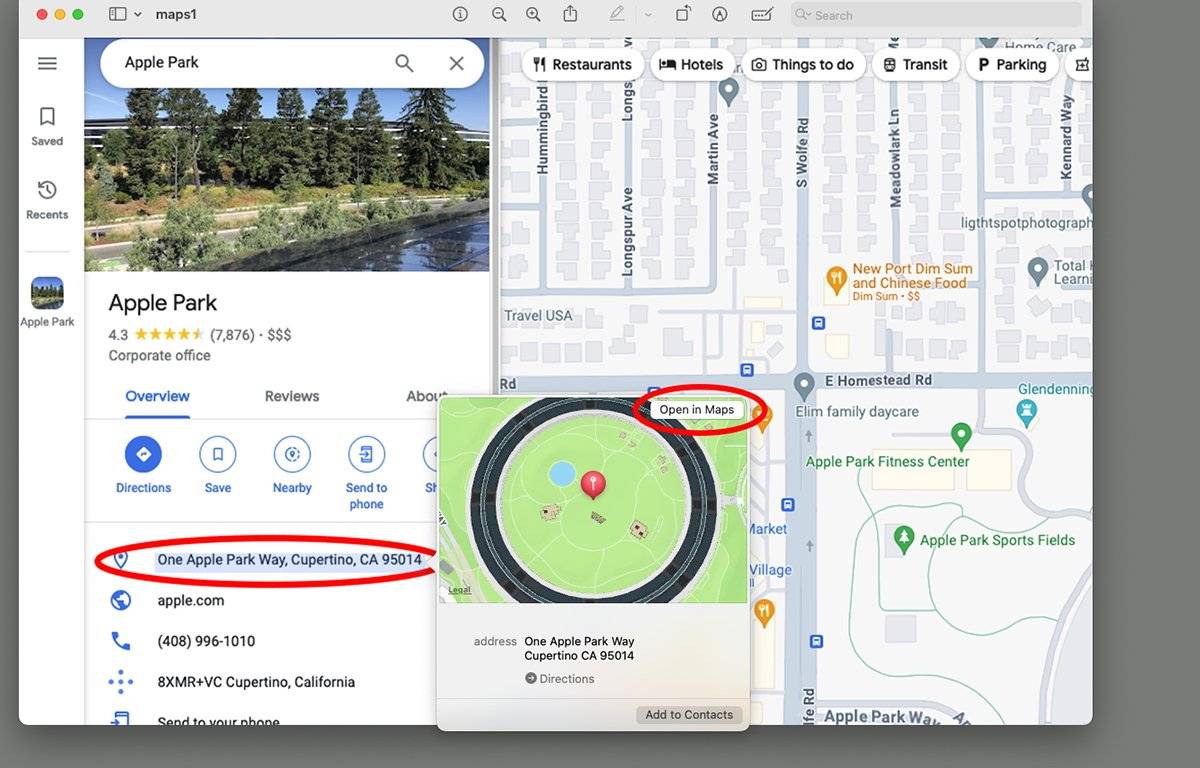 接下来,从启动磁盘上的 /Applications 文件夹或 Dock 打开 Apple 地图应用程序,然后将复制的 URL 粘贴到主窗口左上角的 Google 地图地址搜索栏中。当您这样做时,地图将显示一个小弹出窗口,地址就在搜索栏下方。
