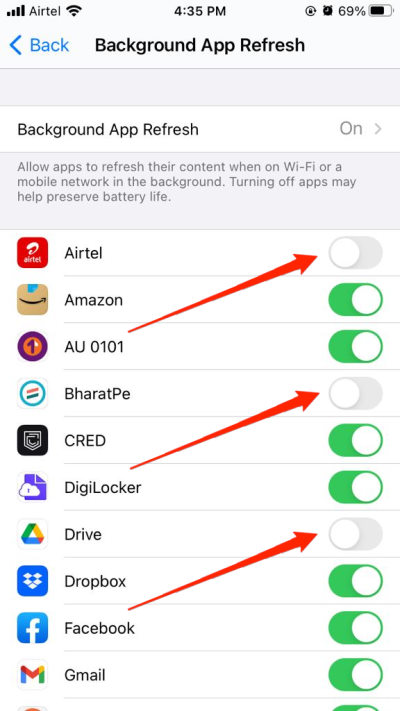 正如苹果本身所提到的,后台活动负载的增加也是这些设备过热背后的一个原因。后台应用程序刷新是一项功能,基本上允许您的应用程序在后台运行。这有助于您随时了解实时通知和其他更新内容。