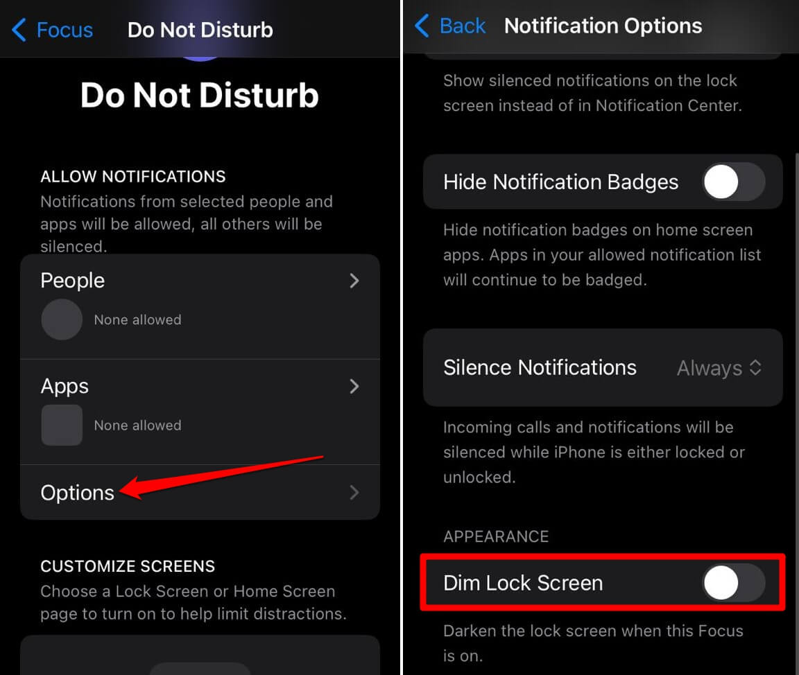 iOS 上的专注模式可以在专注模式上的特定功能处于活动状态时使墙纸变暗。此功能称为暗淡锁定屏幕。您必须禁用它,这是如何做到的。