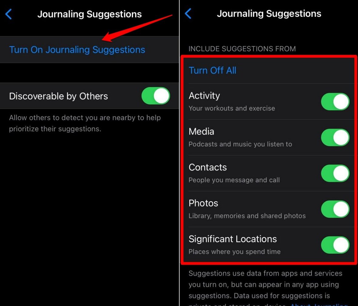 启用“日记”应用的权限后,允许 iOS 将用于建议使用“日记”提示的所有元素。这将帮助您更好地理解和使用日记应用程序。