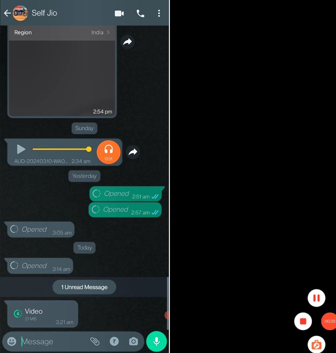 有趣的是,屏幕录像机可以捕获屏幕内容,直到我在WhatsApp的聊天选项卡上。访问我收到观看一次视频的对话也被录制下来。