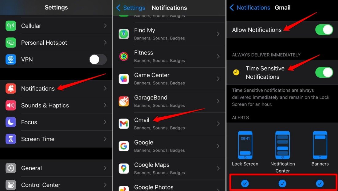 - 在锁定屏幕、横幅和通知中心上选择通知警报。