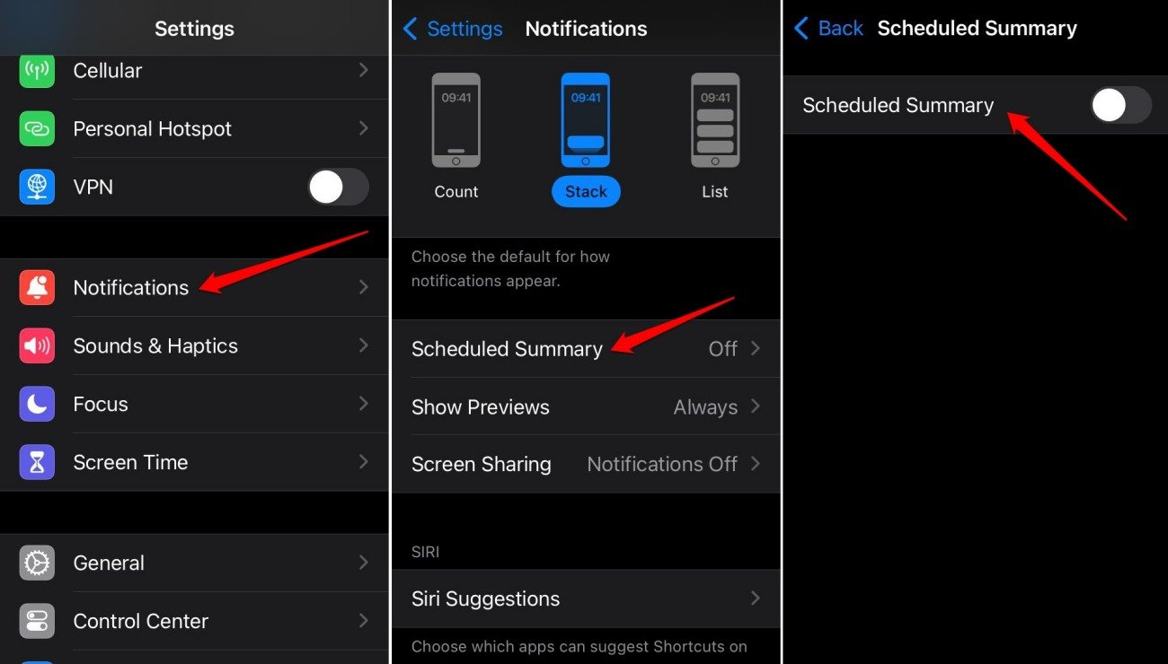 此外,请检查是否已在iPhone上启用通知的预定摘要。它通常会累积非时间敏感的通知来向您显示,从而阻止其他应用程序通知出现。请考虑关闭 iPhone 上的“计划摘要”功能。
