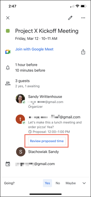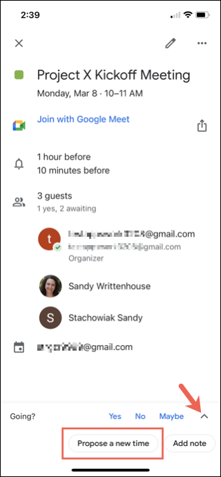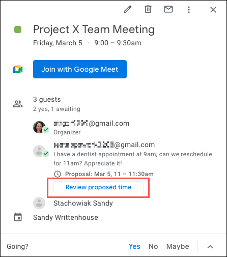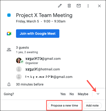 若要重新安排会议时间,请给自己节省电话或电子邮件。使用Google日历,您可以使用内置的“建议新时间”功能直接从活动邀请中建议新的时间或日期。