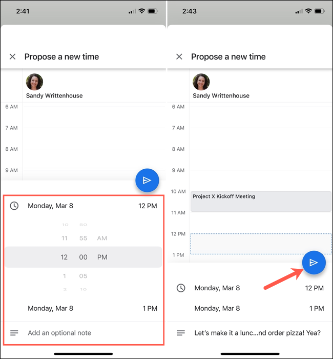 使用底部的日期和时间部分选择您的建议。您可以选择包含一条消息,就像您可以在线上一样。完成后,点击看起来像箭头的蓝色发送图标。