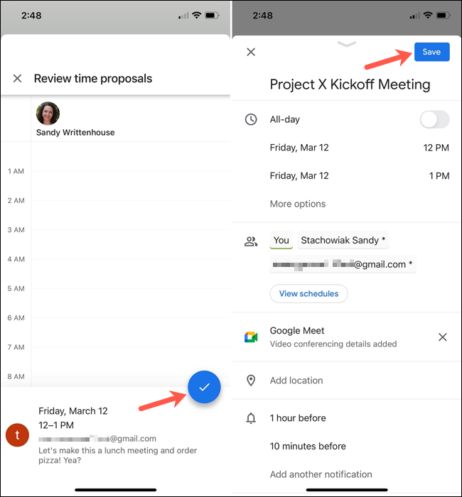 如果他们想接受您的建议,则将其选中蓝色的复选标记图标,然后在下一个屏幕上选择“保存”,这会将事件与新的日期和/或时间一起保存。
