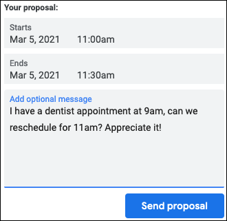 选择建议的新时间后,可以在框中添加可选消息。完成后,点击“发送提案”。