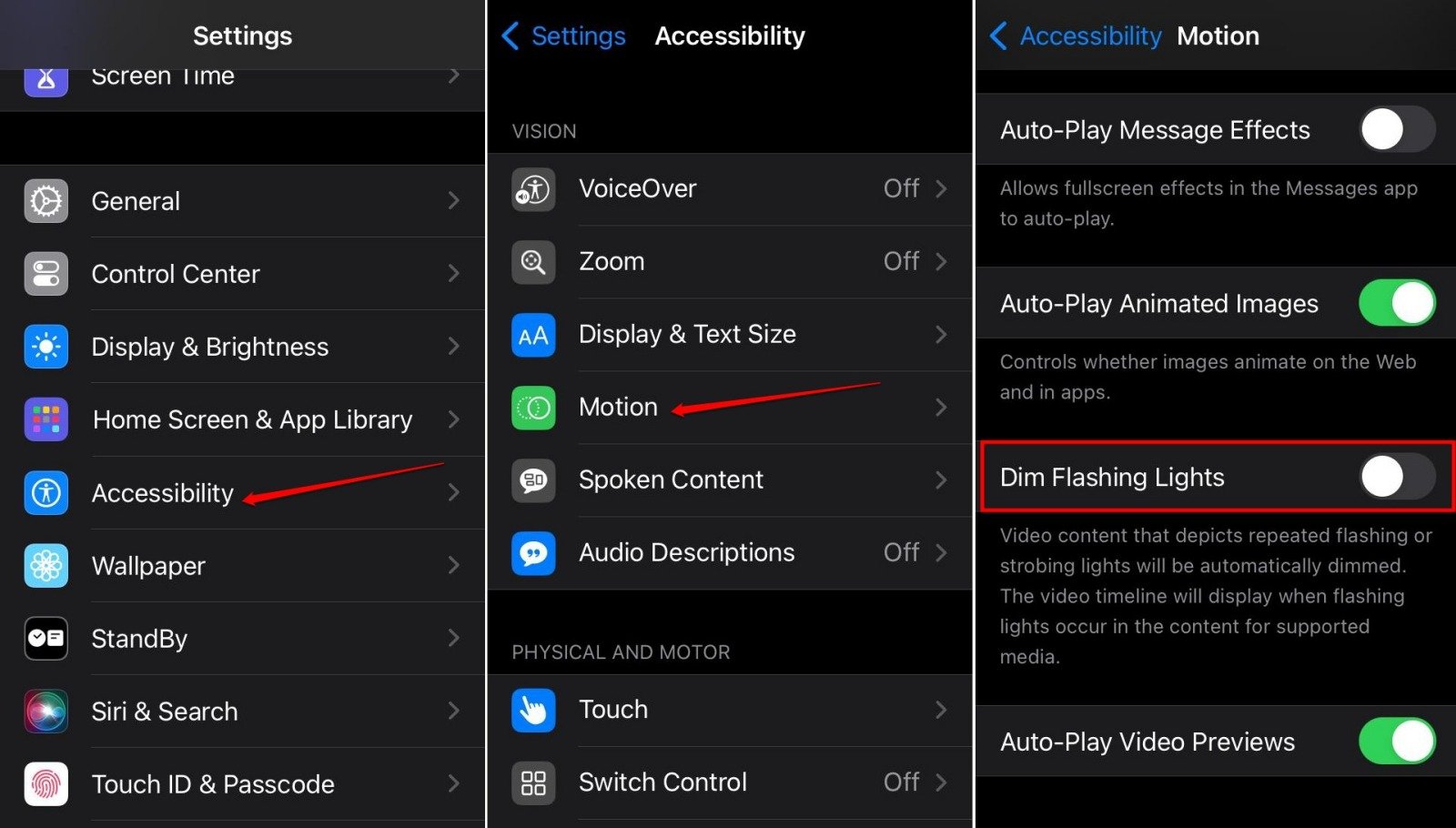 “昏暗的闪光灯”功能有助于减少您在 iPhone 上观看的视频内容中的闪光灯和频闪灯。有时,它可能会降低屏幕的亮度并限制屏幕内容的清晰视图。