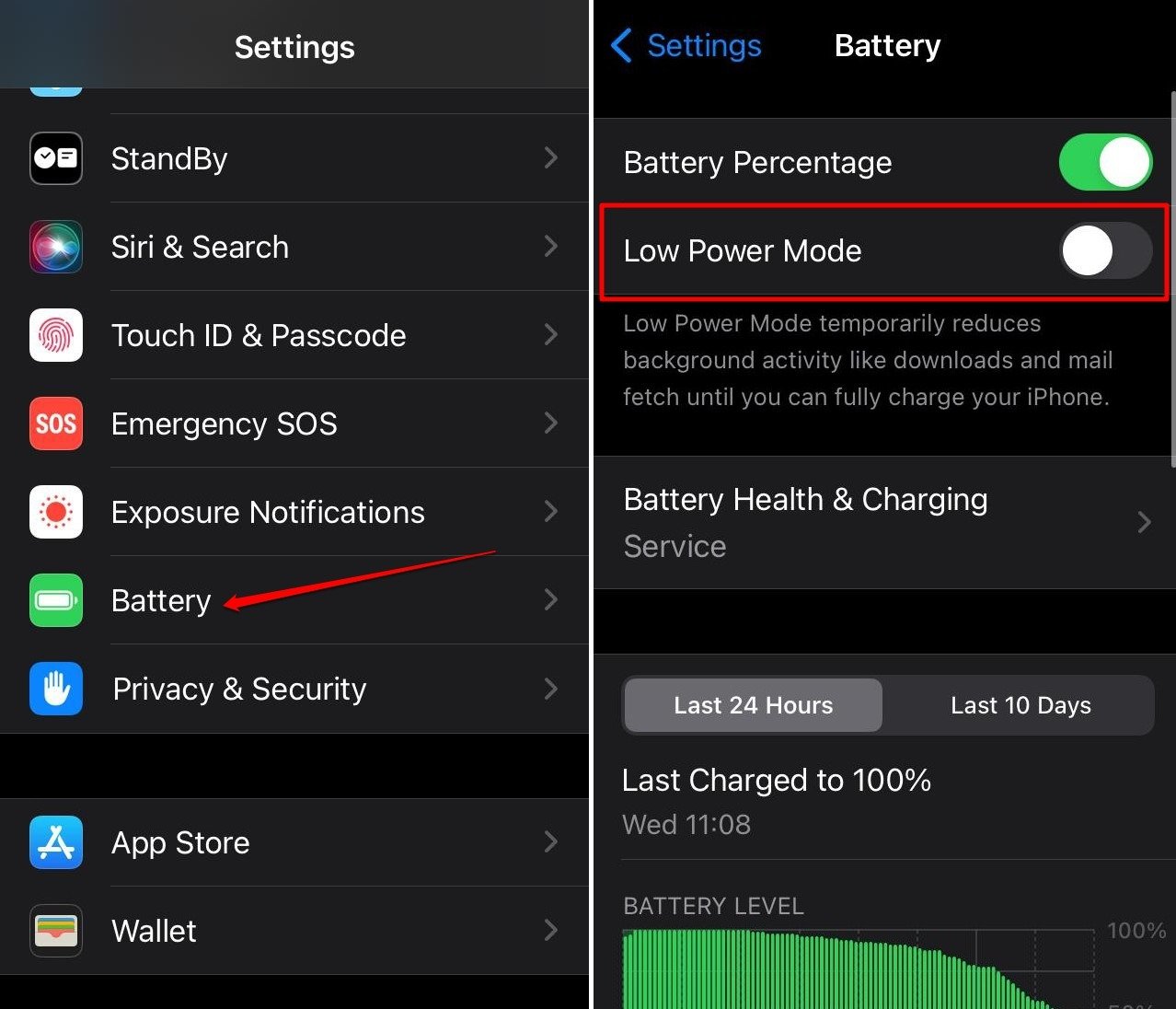 当 iPhone 上的电池电量不足时,低功耗模式会被激活。它将限制iOS上的一些功能,并且亮度级别会下降。