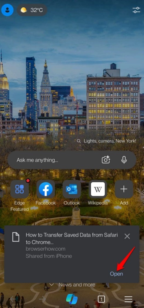 同样,对于任何其他智能手机设备,您可以启动 Edge 应用程序。它应该显示通知以及要打开的链接。点击“开始”屏幕上的“打开”命令以浏览页面。