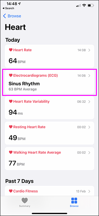 如果看不到该选项,请转到“浏览”>“心脏”>“心电图(ECG)”,然后点按“设置ECG应用程序”并按照设置说明进行操作。