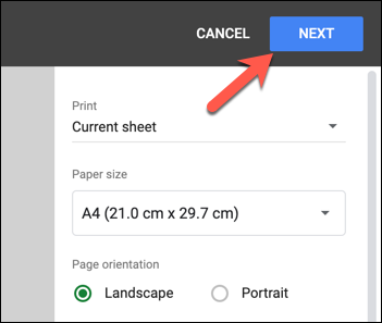 使用右侧的面板确认其他打印设置,然后使用左侧的打印预览面板检查电子表格的布局。如果您愿意继续,请单击“下一步”开始打印过程。