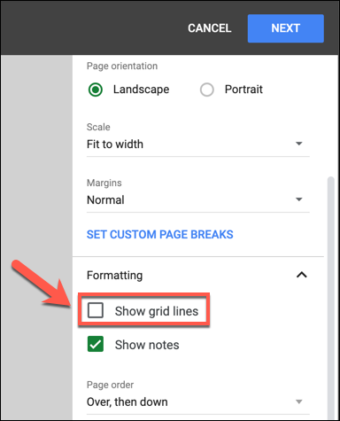 在“打印设置”菜单中,在右侧菜单面板中选择“格式”类别选项。从下面列出的选项中,取消选中“显示网格线”选项。