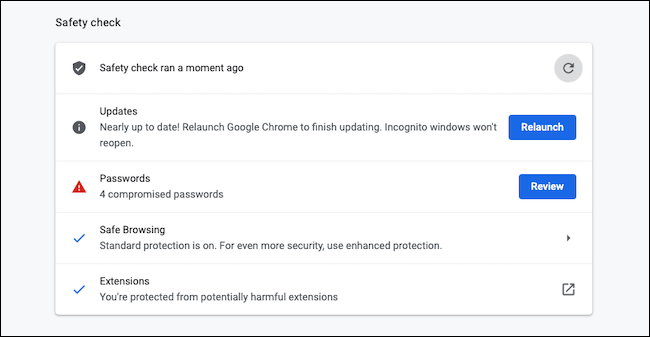 安全检查完成后,Chrome会针对可能需要您立即注意的所有事项(例如查看受感染的凭据)拉出快捷方式。