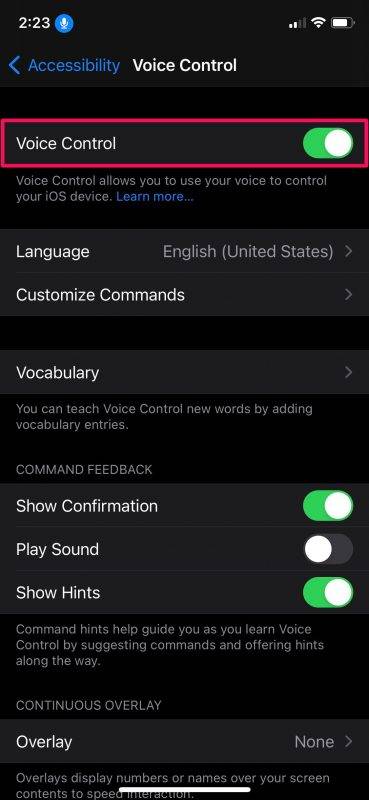 - 在这里,在菜单顶部,您会找到启用或禁用语音控制的切换开关。打开该功能并锁定您的 iPhone。