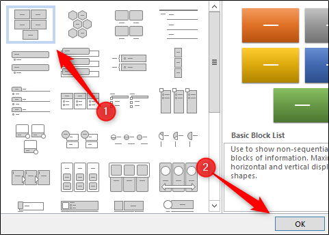 接下来,从所选选项卡的可用选项中选择要使用的SmartArt图形。我们将使用“基本阻止列表” SmartArt图形。选中后,单击“确定”。